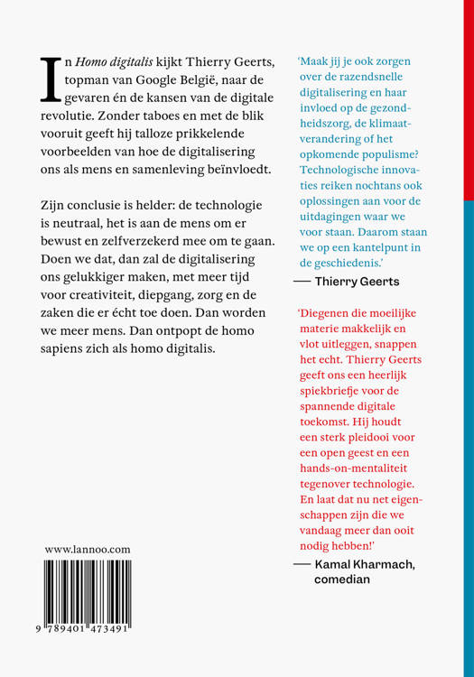 In 'Homo digitalis' kijkt Thierry Geerts, topman van Google België, naar de gevaren én de kansen van de digitale revolutie. Zonder taboes en met de blik vooruit geeft hij talloze prikkelende voorbeelden van hoe de digitalisering ons als mens en samenleving beïnvloedt. Zijn conclusie is helder: de technologie is neutraal, het is aan de mens om er bewust en zelfzeker mee om te gaan. Doen we dat, dan zal de digitalisering ons gelukkiger maken, met meer tijd voor creativiteit, diepgang, zorg en de zaken die er écht toe doen. Dan worden we meer mens. Dan ontpopt de homo sapiens zich als homo digitalis.
