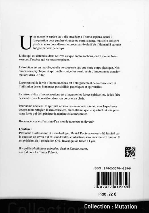 Une nouvelle espèce va-t-elle succéder à l’Homo Sapiens actuel ? La question peut paraître étrange ou extravagante, mais elle doit être posée si nous considérons le processus évolutif de l’Humanité sur une longue période de temps. L’évolution est en marche, et elle ne concerne pas que notre corps physique. Nos dimensions psychique et spirituelle vont, elles aussi, subir d’importantes transformations dans le futur. L’idée qui est défendue dans ce livre est que Homo Noeticus, ou l’Homme Nouveau, est l'’espèce qui va nous remplacer. L’axe central de la vie d’Homo Noeticus est l’élargissement de la conscience et l’utilisation à des fins évolutives positives et constructives de ses immenses possibilités psychiques et spirituelles. La raison d’être d’Homo Noeticus est d’incarner les forces spirituelles, de les faire descendre dans la matière, dans son corps et sa chair. Il opérera en lui-même la transmutation de ce qui est appelé dans le livre la « matière/matière » en « matière/Lumière ». Il façonnera son Corps glorieux, ou Corps céleste, celui qu’évoquait Saint Paul dans son épître aux Corinthiens. Pour Homo Noeticus, le spirituel ne sera pas un monde lointain vers lequel nous devons nous réfugier. Il sera conscient, au contraire, que le spirituel est une puissante force qui doit pénétrer la matière et la transmuter. Homo Noeticus est l’artisan d’un monde nouveau en devenir.