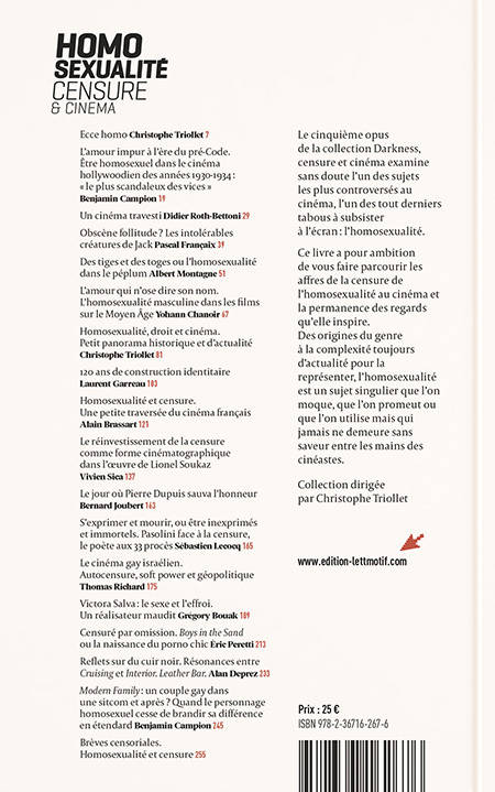 Table des matières Ecce homo. Christophe Triollet L’amour impur à l’ère du pré-code. Être homosexuel dans le cinéma hollywoodien des années 1930-1934. Benjamin Campion Un cinéma travesti. Didier Roth-Bettoni Obscène follitude. Les intolérables créatures de Jack. Pascal Françaix Des tiges et des toges ou l’homosexualité dans le peplum. Albert Montagne L’amour qui n’ose dire son nom. L’homosexualité masculine dans les films sur le Moyen Âge. Yohann Chanoir Homosexualité, droit et cinéma. Petit panorama historique et d’actualité. Christophe Triollet 120 ans de construction identitaire. Laurent Garreau Homosexualité et censure. Une petite traversée du cinéma français. Alain Brassart Le réinvestissement de la censure comme forme cinématographique dans l’œuvre de Lionel Soukaz. Vivien Sica Le jour où Pierre Dupuis sauva l’honneur. Bernard Joubert S’exprimer et mourir ou être inexprimés et immortels. Pasolini face à la censure, le poète aux 33 procès. Sébastien Lecocq Le cinéma gay israélien. Autocensure, soft power et géopolitique. Thomas Richard Victor Salva : le sexe et l’effroi. Un réalisateur maudit. Grégory Bouak Censuré par omission. Boys in the Sand ou la naissance du porno chic. Eric Peretti Reflets sur du cuir noir. Résonances entre Cruising et Interior. Leather Bar. Alan Deprez Modern Family : un couple gay dans une sitcom et après ? Benjamin Campion Brèves censoriales