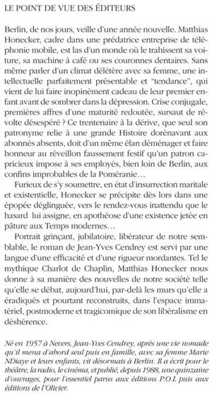 Berlin, de nos jours, veille d'une année nouvelle. Matthias Honecker, cadre dans une prédatrice entreprise de téléphonie mobile, est las d'un monde où le trahissent sa voiture, sa machine à café ou ses couronnes dentaires. Sans même parler d'un climat délétère avec sa femme, une intellectuelle parfaitement présentable et "tendance", qui vient de lui faire inopinément cadeau de leur premier enfant avant de sombrer dans la dépression. Crise conjugale, premières affres d'une maturité re doutée, sursaut de révolte désespéré ? Ce trentenaire à la dérive, que seul son patronyme relie à une grande Histoire dorénavant aux abonnés absents, doit d'un même élan déménager et faire honneur au réveillon faussement festif qu'un patron capricieux impose à ses employés, bien loin de Berlin, aux confins improbables de la Poméranie... Furieux de s'y soumettre, en état d'insurrection maritale et existentielle, Honecker se précipite dès lors dans une épopée déglinguée, vers le rendez-vous inattendu que le hasard lui assigne, en apothéose d'une existence jetée en pâture aux Temps modernes... Portrait grinçant, jubilatoire, libérateur de notre semblable, le roman de Jean-Yves Cendrey est servi par une langue d'une efficacité et d'une rigueur mordantes. Tel le mythique Charlot de Chaplin, Matthias Honecker nous donne à sa manière des nouvelles de notre société telle qu'elle se débat, aujourd'hui, par-delà les murs qu'elle a éradiqués et pourtant reconstruits, dans l'espace immatériel, postmoderne et tragicomique de son libéralisme en déshérence.