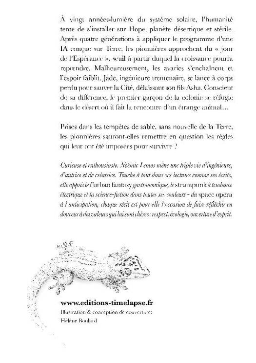 À vingt années-lumière du système solaire, l'humanité tente de s'installer sur Hope, planète désertique et stérile. Après quatre générations à appliquer le programme d'une IA conçue sur Terre, les pionnières approchent du "jour de l'Espérance", seuil à partir duquel la croissance pourra reprendre. Malheureusement, les avaries s'enchaînent et l'espoir faiblit. Jade, ingénieure trentenaire, se lance à corps perdu pour sauver la Cité, délaissant son fils Asha. Conscient de sa différence, le premier garçon de la colonie se réfugie dans le désert où il fait la rencontre d'un étrange animal...