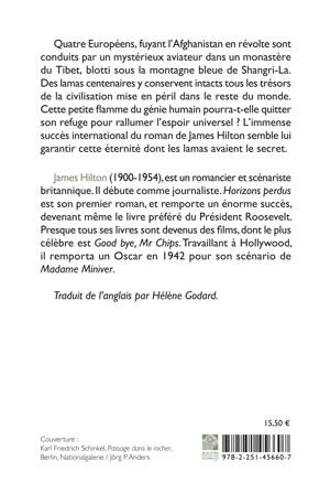 Quatre Européens, fuyant l’Afghanistan en révolte sont conduits par un mystérieux aviateur dans un monastère du Tibet, blotti sous la montagne bleue de Shangri-La. Des lamas centenaires y conservent intacts tous les trésors de la civilisation mise en péril dans le reste du monde. Cette petite flamme du génie humain pourra-t-elle quitter son refuge pour rallumer l’espoir universel ? L’immense succès international du roman de James Hilton semble lui garantir cette éternité dont les lamas avaient le secret.