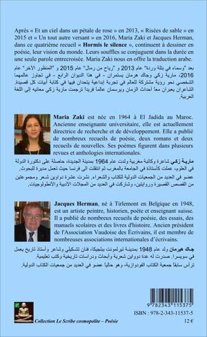 Après "Et un ciel dans un pétale de rose" (2013), "Risées de sable" (2015) et "Un tout autre versant" (2016), Maria Zaki et Jacques Herman, continuent dans ce recueil à transcender leurs visions personnelles du monde pour nous livrer leur expérience poétique formée par leurs souffles conjugués.