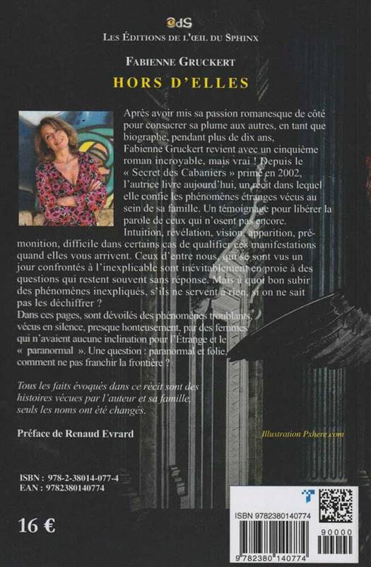 Après avoir mis sa passion romanesque de côté pour consacrer sa plume aux autres, en tant que biographe, pendant plus de dix ans, Fabienne Gruckert revient avec un cinquième roman incroyable, mais vrai ! Depuis le Secret des Cabaniers primé en 2002, l'autrice livre aujourd'hui, un récit dans lequel elle confie les phénomènes étranges vécus au sein de sa famille. Un témoignage pour libérer la parole de ceux qui n'osent pas encore. Intuition, révélation, vision, apparition, prémonition, difficile dans certains cas de qualifier ces manifestations quand elles vous arrivent. Ceux d'entre nous, qui se sont vus un jour confrontés à l'inexplicable sont inévitablement en proie à des questions qui restent souvent sans réponse. Mais à quoi bon subir des phénomènes inexpliqués, s'ils ne servent à rien, si on ne sait pas les déchiffrer ? Dans ces pages, sont dévoilés des phénomènes troublants, vécus en silence, presque honteusement, par des femmes qui n'avaient aucune inclination pour l'Étrange et le paranormal . Une question: paranormal et folie, comment ne pas franchir la frontière ? Tous les faits évoqués dans ce récit sont des histoires vécues par l'auteur et sa famille, seuls les noms ont été changés.