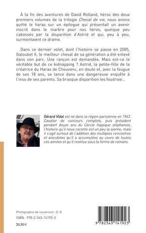 Dans ce dernier volet de la trilogie Cheval de vie, Galoubet II, le meilleur cheval de sa génération a été enlevé dans son parc. Une rançon est demandée. Mais est-ce le véritable but de ce kidnapping ? Astrid, la petite-fille de la créatrice du Haras de Chouvenc, en doute et, avec la fougue de ses 18 ans, se lance dans une dangereuse enquête à