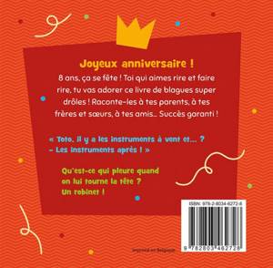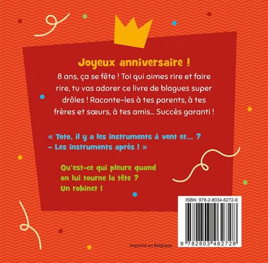 Joyeux anniversaire ! Ce livre contient les blagues les plus drôles pour les enfants qui fêtent leur 8e anniversaire. C'est le meilleur des cadeaux pour tous ceux qui aiment les blagues. De quoi ravir le roi ou la reine de la fête ! C'est blanc, ça monte et ça descend. Qu'est-ce que c'est ? Un flocon qui s'est perdu !