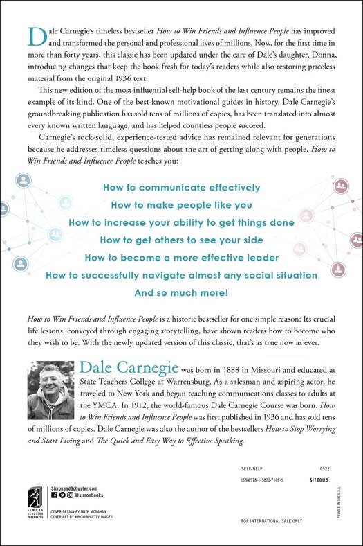 How to Win Friends and Influence People--the most impactful self-help book to appear in the last century--introduces updated content for today's readers and remains the finest book of its kind. One of the best-known motivational books in history, Dale Carnegie's rock-solid, experience-tested advice has remained relevant for generations because he addresses timeless questions about the art of getting along with people.