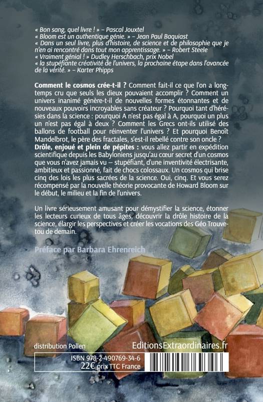 Un livre sérieusement amusant pour démystifier la science, étonner les lecteurs curieux de tous âges, découvrir la drôle histoire de la science, élargir les perspectives et créer les vocations des Géo Trouvetou de demain. « Bon sang, quel livre ! » – Pascal Jouxtel « Bloom est un authentique génie. »Â – Jean Paul Baquiast « Dans un seul livre, plus d’histoire, de science et de philosophie que je n’en ai rencontré dans tout mon apprentissage. » – Robert Steele « Vraiment génial ! » Dudley Herschbach, prix Nobel « la stupéfiante créativité de l’univers, (...) la prochaine étape dans l’avancée de la vérité. »Â – Karter Phipps Comment le cosmos fait-il ce que l'on a longtemps cru que seuls les dieux pouvaient accomplir ? Comment un univers inanimé génère-t-il de nouvelles formes étonnantes et de nouveaux pouvoirs incroyables sans créateur ? Comment crée-t-il ? Pourquoi tant d’hérésies dans la science : pourquoi A n'est pas égal à A, pourquoi un plus un n'est pas égal à deux ? Comment les Grecs ont utilisé des ballons de football pour réinventer l’univers ? Et pourquoi Benoît Mandelbrot, le père des fractales, s’est-il rebellé contre son oncle ? Drôle, enjoué et plein de pépites : vous allez partir en expédition scientifique depuis les babyloniens jusqu’au coeur secret d'un cosmos que vous n'avez jamais vu — stupéfiant, d’une inventivité électrisante, ambitieux et passionné, fait de chocs colossaux. Un cosmos qui brise cinq des lois les plus sacrées de la science. Oui, cinq. Et vous serez récompensé par la nouvelle théorie provocante de Howard Bloom sur le début, le milieu et la fin de l’univers. Howard Bloom, appelé « le Darwin, le Newton, l'Einstein et le Freud du XXIe siècle » et « le prochain Stephen Hawking », fondateur de l'International Paleopsychology Project et du Space Development Steering Committee avec Buzz Aldrin et Edgar Mitchell, membre fondateur de la Epic of Evolution Society, a publié des dizaines d’articles scientifiques et est apparu sur plus de cent chaines aux USA, après avoir révolutionné le marketing musical dans les années 60. Sa spécialité est le comportement de groupe, des atomes aux êtres humains. Préface par Barbara Ehrenreich