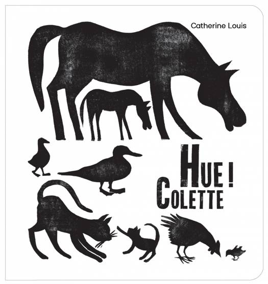 Chaque double page présente les silhouettes noires d'un animal et de son petit ainsi que leur cri.