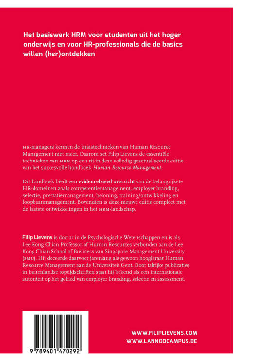 HR-managers kennen de basistechnieken van Human Resource Management niet meer. Daarom zet Filip Lievens de essentiële technieken van HRM op een rij in deze volledig geactualiseerde editie van het succesvolle handboek Human Resource Management. Dit handboek biedt een evidencebased overzicht van de belangrijkste HR-domeinen zoals competentiemanagement, employer branding, selectie, prestatiemanagement, beloning, training/ontwikkeling en loopbaanmanagement. Bovendien is deze nieuwe editie compleet met de laatste ontwikkelingen in het HRM-landschap.