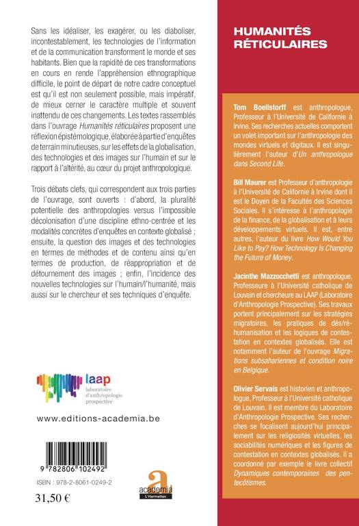 Sans les idéaliser, les exagérer, ou les diaboliser, incontestablement, les technologies de l’information et de la communication transforment le monde et ses habitants. Les textes rassemblés dans l’ouvrage Humanités réticulaires proposent une réflexion épistémologique, élaborée à partie d’enquêtes de terrain minutieuses, sur les effets de la globalisation, des technologies et des images sur l’humain et sur le rapport à l’altérité, au cœur du projet anthropologique.