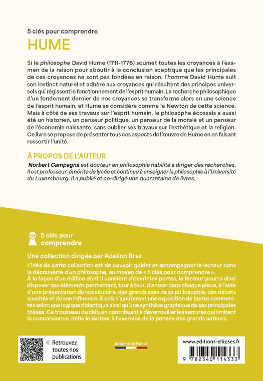 Si le philosophe David Hume (1711-1776) soumet toutes les croyances à l’examen de la raison pour aboutir à la conclusion sceptique que les principales de ces croyances ne sont pas fondées en raison, l’homme David Hume suit son instinct naturel et adhère aux croyances qui résultent des principes universels qui régissent le fonctionnement de l’esprit humain. La recherche philosophique d’un fondement dernier de nos croyances se transforme alors en une science de l’esprit humain, et Hume se considère comme le Newton de cette science. Mais à côté de ses travaux sur l’esprit humain, le philosophe écossais a aussi été un historien, un penseur politique, un penseur de la morale et un penseur de l’économie naissante, sans oublier ses travaux sur l’esthétique et la religion. Ce livre se propose de présenter tous ces aspects de l’œuvre de Hume en en faisant ressortir l’unité.