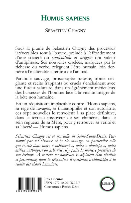 En un réquisitoire implacable contre l’Homo sapiens, sa rage de ravages, sa thanatophilie et son autolâtrie, ces sept nouvelles le renvoient à sa place définitive, dans le terreau fossoyeur de ses chimères, dans le sein rugueux de sa Mère, pour y retrouver sa vérité et sa liberté — Humus sapiens.