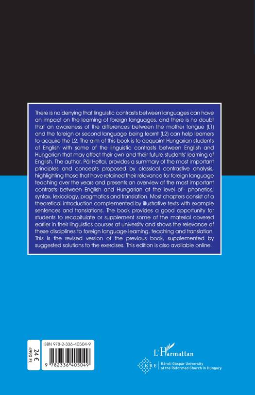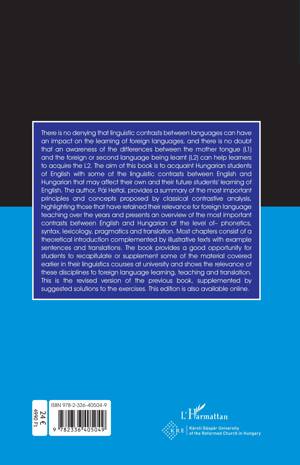 There is no denying that linguistic contrasts between languages can have an impact on the learning of foreign languages, and there is no doubt that an awareness of the differences between the mother tongue (L1) and the foreign or second language being learnt (L2) can help learners to acquire the L2. The aim of this book is to acquaint Hungarian students of English with some of the linguistic contrasts between English and Hungarian that may affect their own and their future students' learning of English. The author, Pál Heltai, provides a summary of the most important principles and concepts proposed by classical contrastive analysis, highlighting those that have retained their relevance for foreign language teaching over the years and presents an overview of the most important contrasts between English and Hungarian at the level of- phonetics, syntax, lexicology, pragmatics and translation. Most chapters consist of a theoretical introduction complemented by illustrative texts with example sentences and translations. The book provides a good opportunity for students to recapitulate or supplement some of the material covered earlier in their linguistics courses at university and shows the relevance of these disciplines to foreign language learning, teaching and translation. This is the revised version of the previous book, supplemented by suggested solutions to the exercises. This edition is also available online.