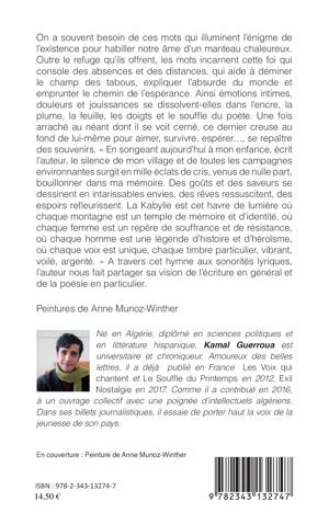 On a souvent besoin de ces mots qui illuminent l'énigme de l'existence pour habiller notre âme d'un manteau chaleureux. Outre le refuge qu'ils offrent, les mots incarnent cette foi qui console des absences et des distances, qui aide à déminer le champ des tabous, expliquer l'absurde du monde et emprunter le chemin de l'espérance. Ainsi émotions intimes, douleurs et jouissances se dissolvent-elles dans l'encre, la plume, la feuille, les doigts et le souffle du poète. À travers cet hymne aux sonorités lyriques, l'auteur nous fait partager sa vision de l'écriture en général et de la poésie en particulier.