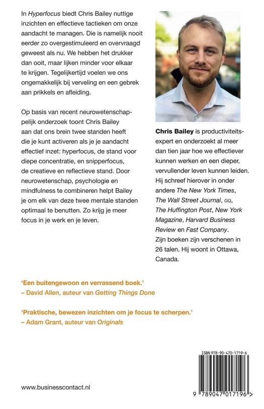 In ‘Hyperfocus’ biedt productiviteitsexpert Chris Bailey nuttige inzichten en effectieve tactieken, op basis van recent neurowetenschappelijk onderzoek, om onze aandacht te managen. Die is namelijk nooit eerder zo overgestimuleerd en overvraagd geweest als nu. We hebben het drukker dan ooit, maar lijken minder voor elkaar te krijgen. Tegelijkertijd voelen we ons vaak ongemakkelijk bij verveling en een gebrek aan prikkels en afleiding.
