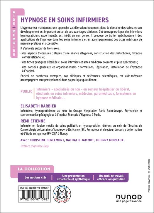 L’hypnose est maintenant une approche validée scientifiquement dans le domaine des soins, et son développement est important du fait de ses avantages cliniques. Cet ouvrage écrit par des infirmiers hypnopraticiens expérimentés est inédit en son genre. Il propose de traiter spécifiquement des applications de l’hypnose dans les soins infirmiers et en accompagnement des actes médicaux de manière pratique et accessible.