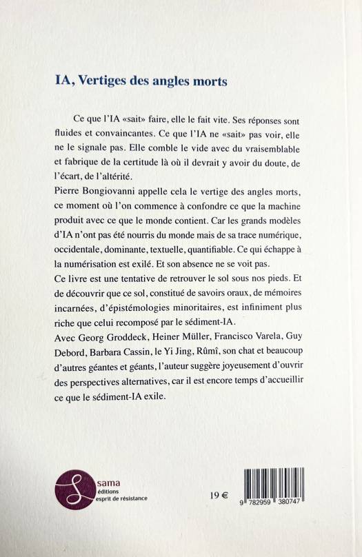 I.A Vertiges des angles morts se tient là où les récits dominants échouent : dans les zones d’indétermination, les marges, les silences. Ni outil à célébrer, ni menace à conjurer, l’IA y est abordée comme un organisme en devenir, traversé par des forces culturelles, symboliques et politiques. Pierre Bongiovanni pratique la dérive. Il met en résonance des pensées éloignées (psychanalyse, philosophie du langage, théorie critique, traditions non occidentales, situationnisme) et dialogue avec l’IA comme on médite : sans urgence, sans finalité imposée, avec une attention flottante. Le livre propose une archipélisation des savoirs. Les pensées ne convergent pas, elles coexistent. Les angles morts ne sont pas des manques, mais des lieux d’émergence. Un texte fragmentaire, attentif, parfois contemplatif, parfois critique, qui invite à habiter autrement notre présent technologique, depuis ses failles et ses vertiges.