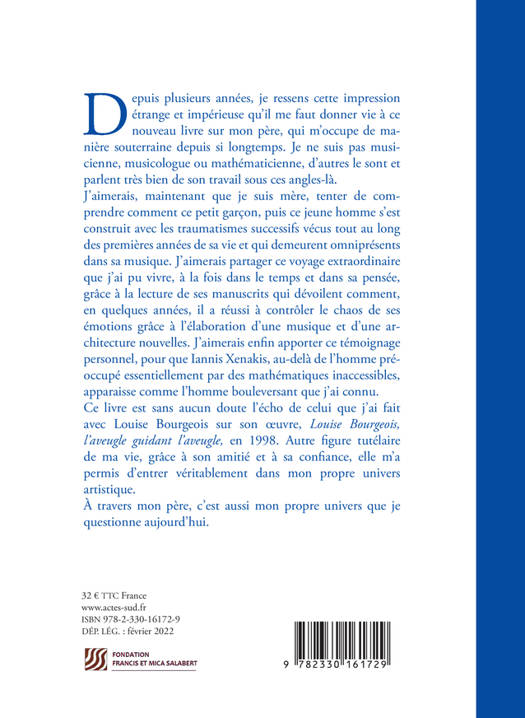 Ce livre, n'est pas une simple biographie consacrée à Iannis Xenakis (1922- 2001), compositeur, mathématicien et architecte, par sa fille Mâkhi. Il s'agit d'abord d'une plongée dans les archives familiales d'où surgissent des documents essentiels à la compréhension du processus d'élaboration de son oeuvre : photographies et portraits de famille, carnets de travail, partitions, plans... L'ouvrage est également scandé par sa parole à travers des extraits de sa correspondance et des nombreux entretiens qu'il a accordés. Ce regard rétrospectif sur son enfance et sa jeunesse, nous éclaire sur les drames familiaux et les traumatismes de l'histoire qui ont façonné une personnalité hors du commun et fondé sa vision créatrice.