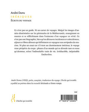 André Doms, poète natif de Namur, a voyagé en Europe pendant des décennies, à la rencontre des populations, des amis, des villes des écrivains, des artistes. Ibériques fait partie d'une trilogie réunie sous le nom d'Écrits du voyage. Le ton de ces récits rappelle celui des écrivains d'entre les deux grandes guerres du xxème siècle, curieux des cultures européennes, intransigeants avec les libertés. André Doms présente ainsi les trois volumes de ses « Écrits du voyage » : « Ce n’est pas un guide. Ni un carnet de voyages. Malgré les images d’années disséminées sur les péninsules de la Méditerranée, resurgissant en sources et se réfléchissant dans l’existence d’un voyageur en vérité. Ce n’est pas une biographie, bien qu’on découvre incidences et coïncidences, séjours et libres détours qui définissent ce voyageur aux antipodes du touriste. Ni plus un essai car s’il tient au cheminement intérieur, le voyage reste péripétie du corps : phases d’un monde qui se déroule tant en nous qu’alentour, selon l’indissoluble train de vie. Irréductible, inépuisable. Enchevêtré. »