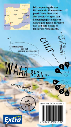 De compacte ANWB Extra reisgids Ibiza biedt naast diverse routes over het eiland en veel praktische tips over hotels en vervoer ook 15 inspirerende bezienswaardigheden die je tijdens je vakantie niet mag missen. Geniet van de sunsetsound bij Cafe del Mar, ga op zoek naar een van de mooiste uitzichten van het eiland bij Plá de Corona, of struin over hippiemarkten Las Dalias en Es Canar.