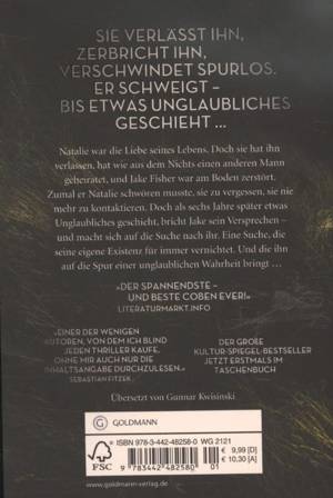 Natalie war die Liebe seines Lebens. Doch sie hat ihn verlassen, hat wie aus dem Nichts einen anderen Mann geheiratet, und Jake Fischer war am Boden zerstört. Bei ihrem Abschied musste er Natalie zudem schwören, sie zu vergessen, sie nie mehr zu kontaktieren. Doch als sechs Jahre später etwas Unglaubliches geschieht, bricht Jake sein Versprechen -und macht sich auf die Suche nach ihr. Eine Suche, die seine eigene gutbürgerliche Existenz für immer zerstört. Und die ihm offenbart, dass die Frau, die er zu lieben glaubte, nie wirklich existiert hat ...
