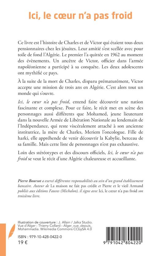 Ce livre est l’histoire de Charles et de Victor qui étaient tous deux pensionnaires chez les jésuites. Leur amitié s’est scellée avec pour toile de fond l’Algérie. Le premier l’a quittée en 1962 au moment des évènements. Un ancêtre de Victor, officier dans l’armée napoléonienne a participé à sa conquête. Les deux adolescents ont mythifié ce pays. À la suite de la mort de Charles, disparu prématurément, Victor accepte une mission de trois ans en Algérie. C’est alors tout un monde qui s’ouvre. Ici, le cœur n’a pas froid, entend faire découvrir une nation fascinante et complexe. Pour ce faire, le récit met en scène des personnages aussi différents que Mohamed, jeune lieutenant dans la nouvelle Armée de Libération Nationale au lendemain de l’Indépendance, qui reste viscéralement attaché à son ancienne institutrice, la mère de Charles, Meriem l’oncologue. Fille de harki, elle appréhende de venir découvrir la Kabylie, berceau de sa famille. Mais cette liste de personnages n’est pas exhaustive. Loin des stéréotypes et des discours officiels, Ici, le cœur n’a pas froid se veut le récit d’une Algérie chaleureuse et accueillante.