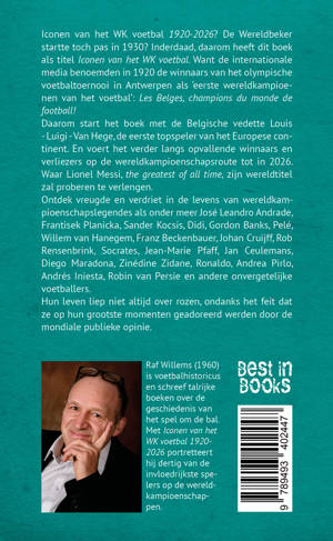 Iconen van het WK voetbal 1920-2026? De Wereldbeker startte toch pas in 1930? Inderdaad, daarom heeft dit boek als titel Iconen van het WK voetbal. Want de internationale media benoemden in 1920 de winnaars van het olympische voetbaltoernooi in Antwerpen als ‘eerste wereldkampioenen van het voetbal’: Les Belges, champions du monde de football! Daarom start het boek met de Belgische vedette Louis - Luigi - Van Hege, de eerste topspeler van het Europese continent. En voert het verder langs opvallende winnaars en verliezers op de wereldkampioenschapsroute tot in 2026. Waar Lionel Messi, the greatest of all time, zijn wereldtitel zal proberen te verlengen. Ontdek vreugde en verdriet in de levens van wereldkampioenschapslegendes als onder meer José Leandro Andrade, Frantisek Planicka, Sander Kocsis, Didi, Gordon Banks, Pelé, Willem van Hanegem, Franz Beckenbauer, Johan Cruijff, Rob Rensenbrink, Socrates, Jean-Marie Pfaff, Jan Ceulemans, Diego Maradona, Zinédine Zidane, Ronaldo, Andrea Pirlo, Andrés Iniesta, Robin van Persie en andere onvergetelijke voetballers. Hun leven liep niet altijd over rozen, ondanks het feit dat ze op hun grootste momenten geadoreerd werden door de mondiale publieke opinie.