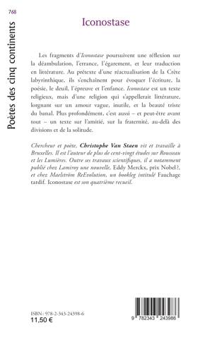 Les fragments d’Iconostase poursuivent une réflexion sur la déambulation, l’errance, l’égarement, et leur traduction en littérature. Au prétexte d’une réactualisation de la Crète labyrinthique, ils s’enchaînent pour évoquer l’écriture, la poésie, le deuil, l’épreuve et l’enfance. Iconostase est un texte religieux, mais d’une religion qui s’appellerait littérature, lorgnant sur un amour vague, inutile, et la beauté triste du banal. Plus profondément, c’est aussi - et peut-être avant tout - un texte sur l’amitié, sur la fraternité, au-delà des divisions et de la solitude.