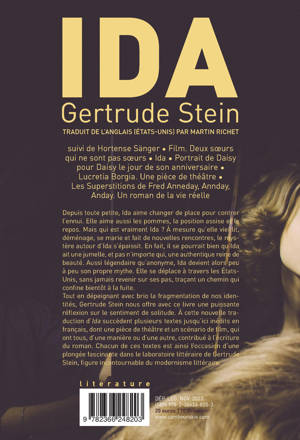 Depuis toute petite, Ida aime changer de place pour contrer l'ennui. Elle aime aussi les pommes, la position assise et le repos. Mais qui est vraiment Ida ? À mesure qu'elle vieillit, déménage, se marie et fait de nouvelles rencontres, le mystère autour d'Ida s'épaissit. En fait, il se pourrait bien qu'Ida ait une jumelle, et pas n'importe qui, une authentique reine de beauté. Aussi légendaire qu'anonyme, Ida devient alors peu à peu son propre mythe. Elle se déplace à travers les États-Unis, sans jamais revenir sur ses pas, traçant un chemin qui confine bientôt à la fuite. Tout en dépeignant avec brio la fragmentation de nos identités, Gertrude Stein nous offre avec ce livre une puissante réflexion sur le sentiment de solitude. À cette nouvelle traduction d'Ida succèdent plusieurs textes jusqu'ici inédits en français, dont une pièce de théâtre et un scénario de film, qui ont tous, d'une manière ou d'une autre, contribué à l'écriture du roman. Chacun de ces textes est ainsi l'occasion d'une plongée fascinante dans le laboratoire littéraire de Gertrude Stein, figure incontournable du modernisme littéraire.