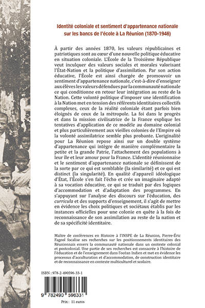 À partir des années 1870, les valeurs républicaines et patriotiques sont au cœur d’une nouvelle politique éducative en situation coloniale. L’École de la Troisième République veut inculquer des valeurs sociales et morales valorisant l’État-Nation et la politique d’assimilation. Par son action éducative, l’École est ainsi chargée de promouvoir un sentiment d’appartenance nationale, c’est-à-dire d’enseigner aux élèves les valeurs défendues par la communauté nationale ce qui conditionne en retour leur intégration au reste de la Nation. Cette volonté politique d’imposer une identification à la Nation met en tension des référents identitaires collectifs complexes, ceux de la réalité coloniale étant parfois bien éloignés de ceux de la métropole. La foi dans le progrès et dans la mission civilisatrice de la France explique les tentatives d’application de ce modèle au domaine colonial et plus particulièrement aux vieilles colonies de l’Empire où la volonté assimilatrice semble plus probante. L’originalité pour La Réunion repose ainsi sur un double système d’appartenance qui intègre de manière complémentaire la petite et la grande Patrie, l’attachement des populations à leur île et leur amour pour la France. L’identité réunionnaise et le sentiment d’appartenance nationale se définissent de la sorte par ce qui est semblable (la similarité) et ce qui est distinct (la singularité). En qualité d’appareil idéologique d’État, l’École s’en fait l’écho et crée un imaginaire adapté à sa vocation éducative, ce qui se traduit par des logiques d’accommodation et d’adaptation des programmes. En s’appuyant sur l’analyse des discours sur l’éducation, des curricula et des supports d’enseignement, il s’agit de mettre en évidence les choix politiques et sociétaux établis par les instances officielles pour une colonie en quête à la fois de reconnaissance de son assimilation au reste de la nation et de sa spécificité identitaire.
