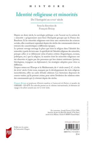 Le présent ouvrage envisage la place que tient la religion dans l'identité des minorités, à partir de trois axes : la spécificité de l'identité religieuse des minorités, puisque celles-ci se définissent selon d'autres critères (linguistiques, sociaux, politiques, etc.) que la religion ; la manière dont les minorités religieuses ont été observées et jugées par des personnes qui leur étaient extérieures (juristes, théologiens, voyageurs ou diplomates) ; les stratégies adoptées pour vivre sa différence.