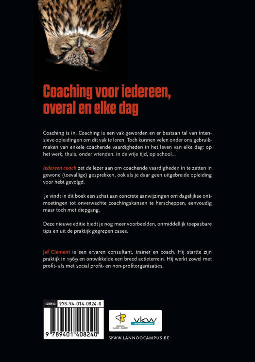 Coachingtips voor iedereen, overal en elke dag Coaching is in. Coaching is een vak geworden en er bestaan tal van intensieve opleidingen om dit vak te leren. Toch kunnen velen onder ons gebruikmaken van enkele coachende vaardigheden in het leven van elke dag: op het werk, thuis, onder vrienden, in de vrije tijd, op school... Iedereen coach zet de lezer aan om coachende vaardigheden in te zetten in gewone (toevallige) gesprekken, ook als je daar geen uitgebreide opleiding voor hebt gevolgd. Je vindt in dit boek een schat aan concrete aanwijzingen om dagelijkse ontmoetingen tot onverwachte coachingskansen te herscheppen, eenvoudig maar toch met diepgang. Deze nieuwe editie biedt je nog meer voorbeelden, onmiddellijk toepasbare tips en uit de praktijk gegrepen cases.