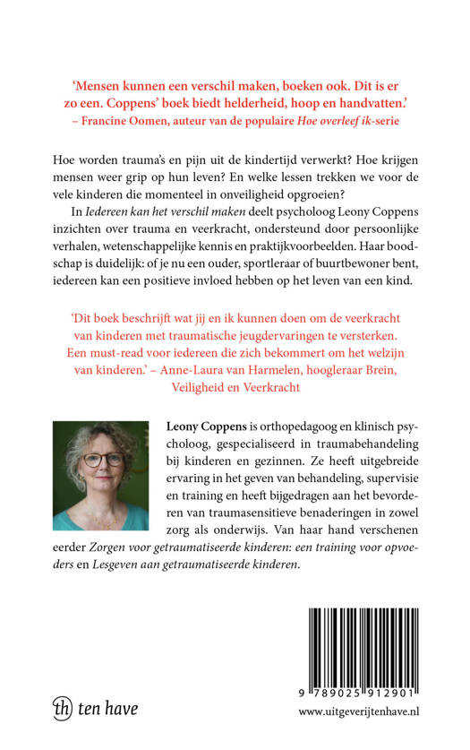 In Iedereen kan het verschil makendeelt psycholoog Leony Coppens inzichten over trauma en veerkracht, geïllustreerd met persoonlijke verhalen en praktijkvoorbeelden. Voor iedereen die een positieve impact wil hebben op het leven van een kind, biedt dit boek waardevolle inzichten en inspiratie.