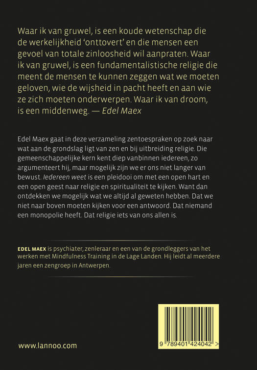 Edel Maex over de gemeenschappelijke kern van zen en religie 'Waar ik van gruwel, is een koude wetenschap die de werkelijkheid 'onttovert' en die mensen een gevoel van totale zinloosheid wil aanpraten. Waar ik van gruwel, is een fundamentalistische religie die meent de mensen te kunnen zeggen wat we moeten geloven, wie de wijsheid in pacht heeft en aan wie ze zich moeten onderwerpen. Waar ik van droom, is een middenweg.' Edel Maex gaat in deze verzameling zentoespraken op zoek naar wat aan de grondslag ligt van zen en bij uitbreiding religie. Die gemeenschappelijke kern kent diep vanbinnen iedereen, zo argumenteert hij, maar mogelijk zijn we er ons niet langer van bewust. Iedereen weet is een pleidooi om met een open hart en een open geest naar religie en spiritualiteit te kijken. Want dan ontdekken we mogelijk wat we altijd al geweten hebben. Dat we niet naar boven moeten kijken voor een antwoord. Dat niemand een monopolie heeft. Dat religie iets van ons allen is.