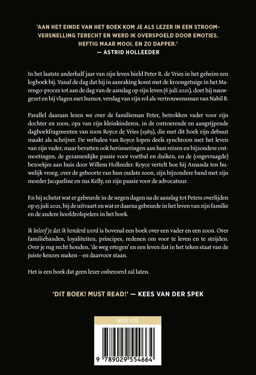 Parallel daaraan lezen we over de familieman Peter, betrokken vader voor zijn dochter en zoon, opa van zijn kleinkinderen, in de ontroerende en aangrijpende dagboekfragmenten van zoon Royce de Vries (1989), die met dit boek zijn debuut maakt als schrijver. De verhalen van Royce lopen deels synchroon met het leven van zijn vader, maar bevatten ook herinneringen aan hun reizen en bijzondere ontmoetingen, de gezamenlijke passie voor voetbal en duiken, en de (ongevraagde) bezoekjes aan huis door Willem Holleeder. Royce vertelt hoe hij Amanda ten huwelijk vroeg, over de geboorte van hun oudste zoon, zijn bijzondere band met zijn moeder Jacqueline en zus Kelly, en zijn passie voor de advocatuur.