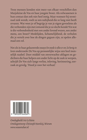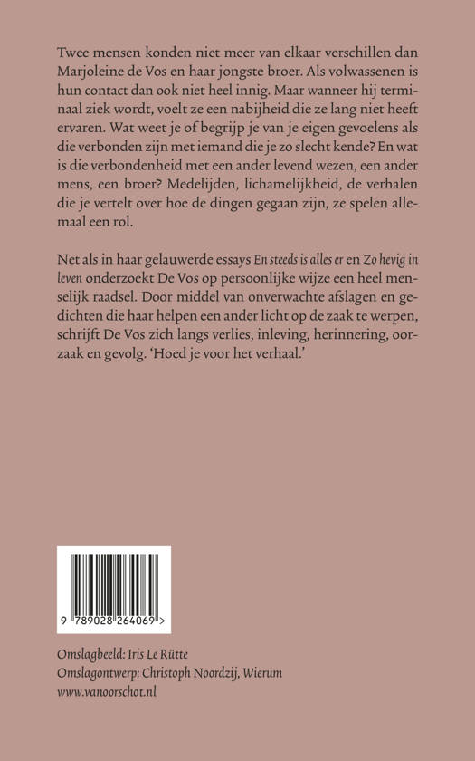 Twee mensen konden niet meer van elkaar verschillen dan Marjoleine de Vos en haar jongste broer. Als volwassenen is hun contact dan ook niet heel innig. Maar wanneer hij terminaal ziek wordt, voelt ze een nabijheid die ze lang niet heeft ervaren. Wat weet je of begrijp je van je eigen gevoelens als die verbonden zijn met iemand die je zo slecht kende? En wat is die verbondenheid met een ander levend wezen, een ander mens, een broer? Medelijden, lichamelijkheid, de verhalen die je vertelt over hoe de dingen gegaan zijn, ze spelen allemaal een rol.