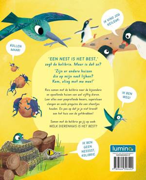 Reis samen met de kolibrie naar de bijzondere en opvallende huizen van wel vijftig dieren. Leer alles over poeprollende kevers, supersluwe slangen en coole pinguïns die van steentjes houden. En pas op dat je je niet brandt aan het huis van de yetikrabben! Samen met de kolibrie ga jij op zoek: WELK DIERENHUIS IS HET BEST?