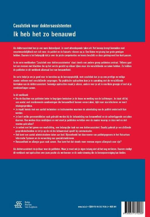 Als doktersassistent ben je een ware duizendpoot. Je voert uiteenlopende taken uit. Het beroep brengt bovendien veel verantwoordelijkheid met zich mee: de patiënt en de huisarts rekenen op je. Een kleine vergissing kan grote gevolgen hebben. Daarom is het belangrijk dat je over de juiste competenties en kennis beschikt en deze geïntegreerd toe kunt passen.In de serie werkboeken ‘Casuïstiek voor doktersassistenten’ staat steeds een andere groep patiënten centraal. Telkens gaat het om mensen met klachten die op het eerste gezicht op elkaar lijken maar die verschillende oorzaken hebben. Zo hebben de patiënten in dit werkboek allemaal last van benauwdheid.De serie helpt je om je goed voor te bereiden op de beroepspraktijk, met casuïstiek kun je op een prettige en veilige manier oefenen met verschillende zorgvragen. Via praktische opdrachten kom je in aanraking met de verschillende kerntaken van de doktersassistent. Sommige opdrachten maak je alleen, andere voer je uit in een klein groepje of met al je medeleerlingen samen.In dit werkboek: • Om de klachten van patiënten beter te begrijpen bestudeer je de bouw en werking van de luchtwegen. Je staat stil bij een aantal veel voorkomende aandoeningen die benauwdheid kunnen veroorzaken, kijkt naar alarmfactoren en voert intakegesprekken.• Je maakt kennis met een aantal technieken en instrumenten waarmee de ademhaling van de patiënt onderzocht kan worden.• Je leert welke geneesmiddelen vaak gebruikt worden bij de behandeling van benauwdheid en de achterliggende oorzaken daarvan. Hoe werken deze medicijnen en wat moet je patiënten vertellen over de manier waarop ze deze wel en niet moeten gebruiken?• Je oefent met het geven van voorlichting, een belangrijke taak van een doktersassistent. Daarbij gebruik jeverschillende gesprekstechnieken en let je op de rol die lichaamstaal speelt bij communicatie.• Ook komt een aantal administratieve taken aan bod. Bijvoorbeeld het doorvoeren van patiëntgegevens in het Huisartsen Informatie Systeem en de verwerking van specialistenbrieven.• Benauwdheid en allergie gaan vaak samen. Hoe komt het dat steeds meer mensen ergens allergisch voor zijn?Als doktersassistent sta je klaar voor de patiënten. Maar je moet ook je eigen belang niet uit het oog verliezen. Daarom eindigt dit werkboek met opdrachten over jouw positie als werknemer en de ondersteuning die de beroepsvereniging kan bieden.