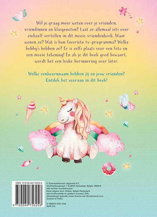 Wil je graag meer weten over je vrienden, vriendinnen en klasgenoten? Laat ze allemaal iets over zichzelf vertellen in dit mooie vriendenboek. Waar wonen ze? Wat is hun favoriete tv-programma? Welke hobby's hebben ze? Er is zelfs plaats voor een foto en een mooie tekening! En als je dit boek goed bewaart, wordt het een leuke herinnering voor later. Welke eenhoornnaam hebben jij en jouw vrienden? Ontdek het vooraan in dit boek!