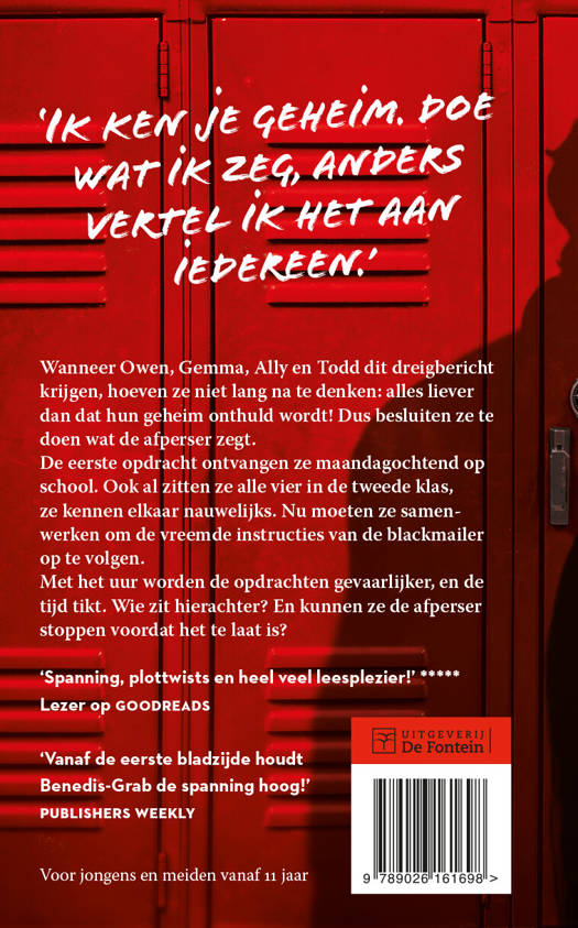 De eerste opdracht ontvangen ze maandagochtend op school. Ook al zitten ze alle vier in de tweede klas, ze kennen elkaar nauwelijks. Nu moeten ze samenwerken om de vreemde instructies van de blackmailer op te volgen.