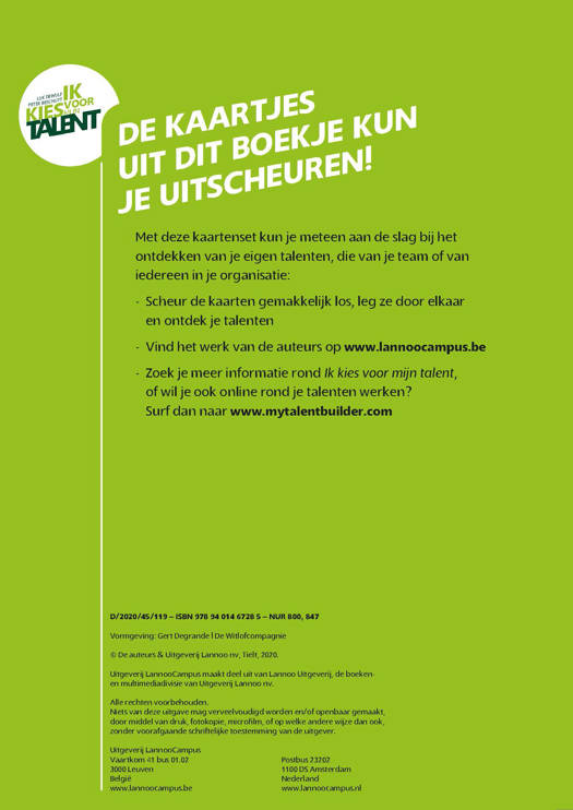Met deze kaartenset kun je meteen aan de slag bij het ontdekken van je eigen talenten, die van je team of van iedereen in je organisatie: - Scheur de kaarten gemakkelijk los, leg ze door elkaar en ontdek je talenten - Vind het werk van de auteurs op www.lannoocampus.be - Zoek je meer informatie rond Ik kies voor mijn talent, of wil je ook online rond je talenten werken? Surf dan naar www.mytalentbuilder.com