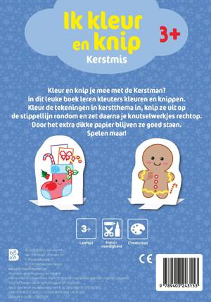 Knip en kleur je mee met de Kerstman? Dit leuke boek is ideaal voor kleuters om te leren kleuren en knippen. Kleur de tekeningen in kerstthema in, knip ze uit op de stippellijnen en zet ze rechtop. Door het extra dikke papier blijven ze goed staan. Spelen maar!