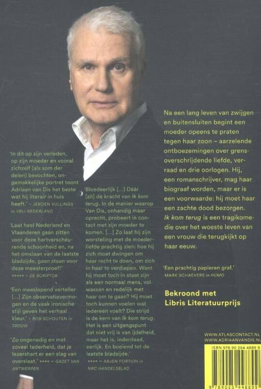 'Ik kom terug' van Adriaan van Dis is een tragikomedie over een moeder-zoonrelatie en het woeste leven van een vrouw die, na een lang leven van zwijgen en buitensluiten, opeens begint te praten tegen haar zoon - aarzelende ontboezemingen over grensoverschrijdende liefde, verraad en drie oorlogen. Hij, een romanschrijver, mag haar biograaf worden, maar er is een voorwaarde: hij moet haar een zachte dood bezorgen.