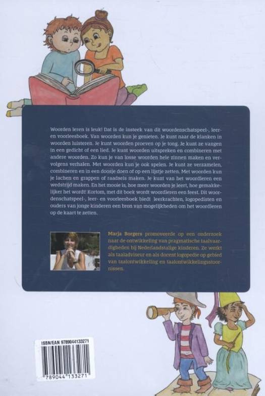 Woorden leren is leuk! Dat is de insteek van dit woordenschatspeel-, leeren voorleesboek. Van woorden kun je genieten. Je kunt naar de klanken in woorden luisteren. Je kunt woorden proeven op je tong. Je kunt ze vangen in een gedicht of een lied. Je kunt woorden uitspreken en combineren met andere woorden. Zo kun je van losse woorden hele zinnen maken en vervolgens verhalen. Met woorden kun je ook spelen. Je kunt ze verzamelen, combineren en in een doosje doen of op een lijstje zetten. Met woorden kun je lachen en grappen of raadsels maken. Je kunt van het woordleren een wedstrijd maken. En het mooie is, hoe meer woorden je leert, hoe gemakkelijker het wordt! Kortom, met dit boek wordt woordleren een feest. Dit woordenschatspeel-, leer- en voorleesboek biedt leerkrachten, logopedisten en ouders van jonge kinderen een bron van mogelijkheden om het woordleren op de kaart te zetten.