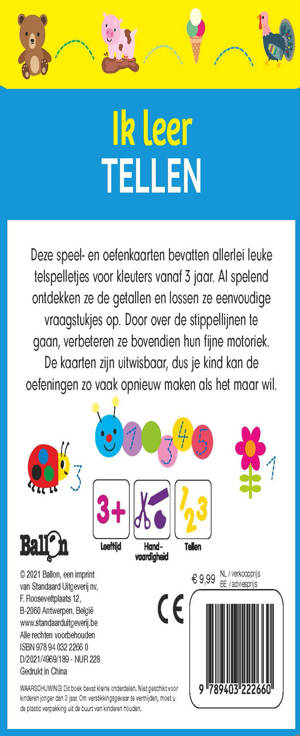 Dit kaartendoosje bevat een stiftje en 52 oefenkaarten, samen goed voor wel 104 leuke telspelletjes voor kleuters vanaf 3 jaar. Op een speelse manier oefenen ze de leerstof van de kleuterschool. Al spelend ontdekken ze de getallen en lossen ze eenvoudige vraagstukjes op. Door over de stippellijnen te gaan, verbeteren ze bovendien hun fijne motoriek en zetten ze hun eerste stapjes naar het leren tellen. De kaarten zijn uitwisbaar, dus je kind kan de oefeningen zo vaak opnieuw maken als het maar wil.