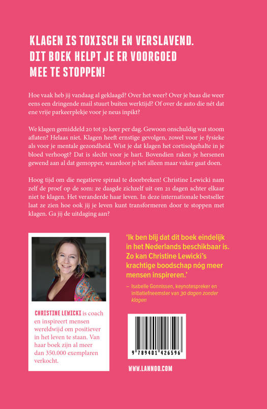 Hoe vaak heb jij vandaag al geklaagd? Over het weer? Over je baas die weer eens een dringende mail stuurt buiten werktijd? Of over de auto die nét dat ene vrije parkeerplekje voor je neus inpikt? We klagen gemiddeld 20 tot 30 keer per dag. Gewoon onschuldig wat stoom aflaten? Helaas niet. Klagen heeft ernstige gevolgen, zowel voor je fysieke als voor je mentale gezondheid. Wist je dat klagen het cortisolgehalte in je bloed verhoogt? Dat is slecht voor je hart. Bovendien raken je hersenen gewend aan al dat gemopper, waardoor je het alleen maar vaker gaat doen. Hoog tijd om die negatieve spiraal te doorbreken! Christine Lewicki nam zelf de proef op de som: ze daagde zichzelf uit om 21 dagen achter elkaar niet te klagen. Het veranderde haar leven. In deze internationale bestseller laat ze zien hoe ook jij je leven kunt transformeren door te stoppen met klagen. Ga jij de uitdaging aan?