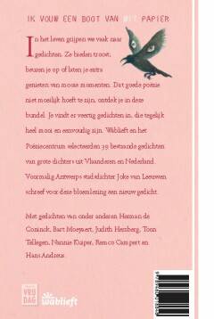 In het leven grijpen we vaak naar gedichten. Ze bieden troost, beuren je op of laten je extra genieten van mooie momenten. Dat goede poëzie niet moeilijk hoeft te zijn, ontdek je in deze bundel. Je vindt er veertig gedichten in, die tegelijk heel mooi en eenvoudig zijn. Wablieft en het Poëziecentrum selecteerden 39 bestaande gedichten van grote dichters uit Vlaanderen en Nederland. Voormalig Antwerps stadsdichter Joke van Leeuwen schreef voor deze bloemlezing een nieuw gedicht.