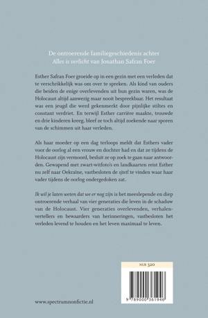 Esther Safran Foer groeide op in een gezin met een verleden dat te verschrikkelijk was om over te spreken. Als kind van ouders die beiden de enige overlevenden uit hun gezin waren, was de Holocaust altijd aanwezig maar nooit bespreekbaar. Het resultaat was een jeugd die werd gekenmerkt door pijnlijke stiltes en constant verdriet. En terwijl Esther carrière maakte, trouwde en drie kinderen kreeg, bleef ze toch altijd zoekende naar sporen van de schimmen uit haar verleden.
