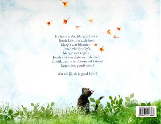 De hond tekt, Margje duwt en Jonah kijkt om zich heen. Margje ziet bloemen - Jonah ziet ijslolly's. Margje ziet vogels - Jonah ziet een glijbaan in de lucht. En kijk daar - een boom vol katten? Regen het goudvissen?